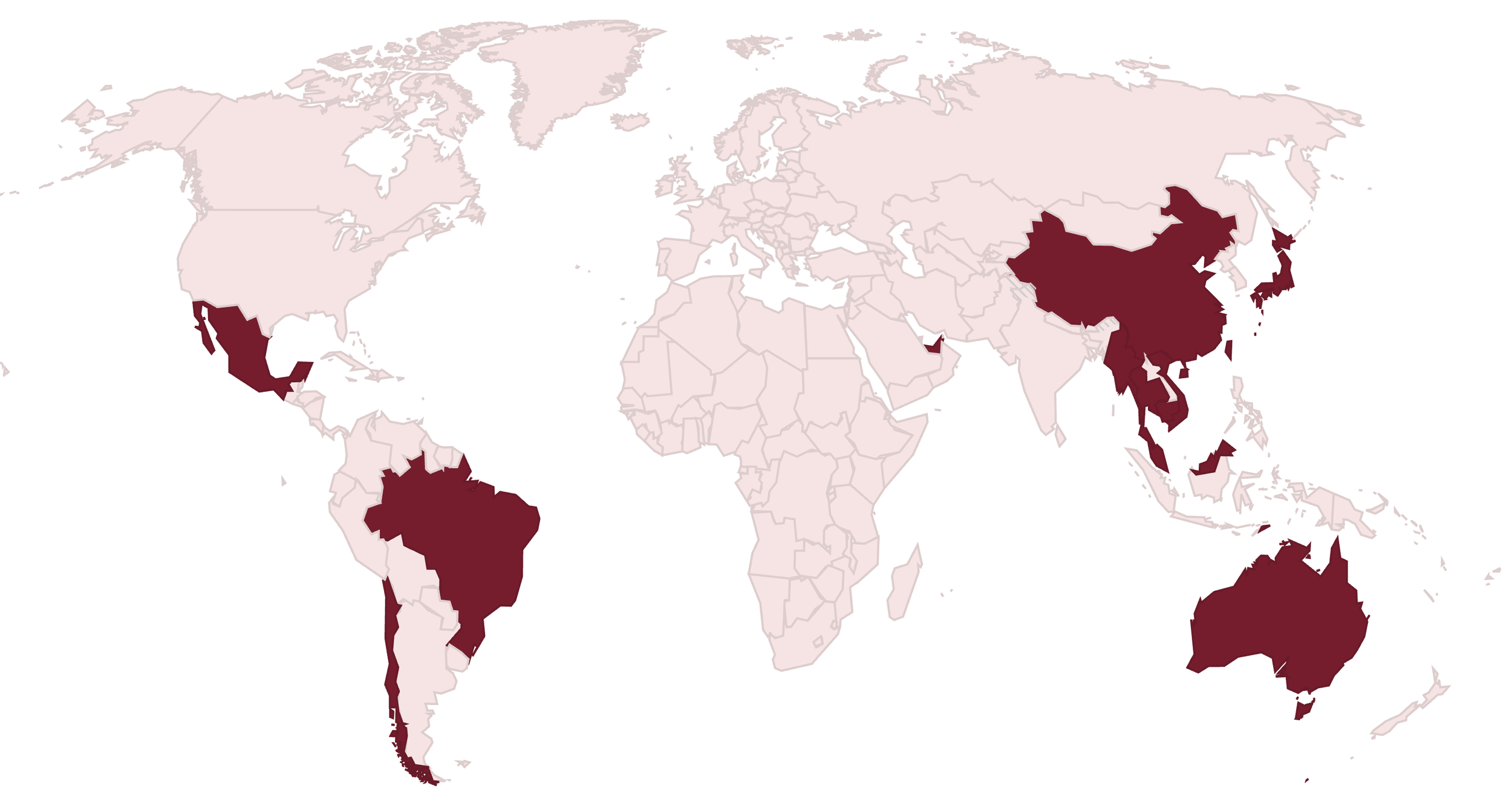 Since Dec, 2020: Australia, Brazil, Cambodia, Chile, China, Hong Kong, Japan, Kiribati, Malaysia, Mexico, Myanmar, Thailand, Timor Leste, Taiwan, Vietnam, and the UAE.